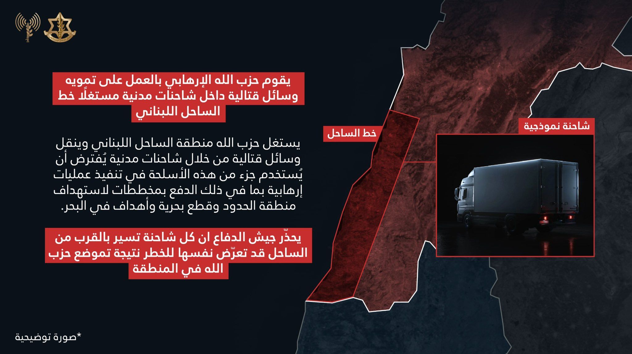 وفقًا لمعلومات استخبارية، يمكننا الآن الكشف عن أن حزب الله يعمل على تمويه وسائل قتالية داخل شاحنات مدنية ويستغل منطقة الساحل اللبناني لنقل هذه الوسائل عبر شاحنات تبدو مدنية.
